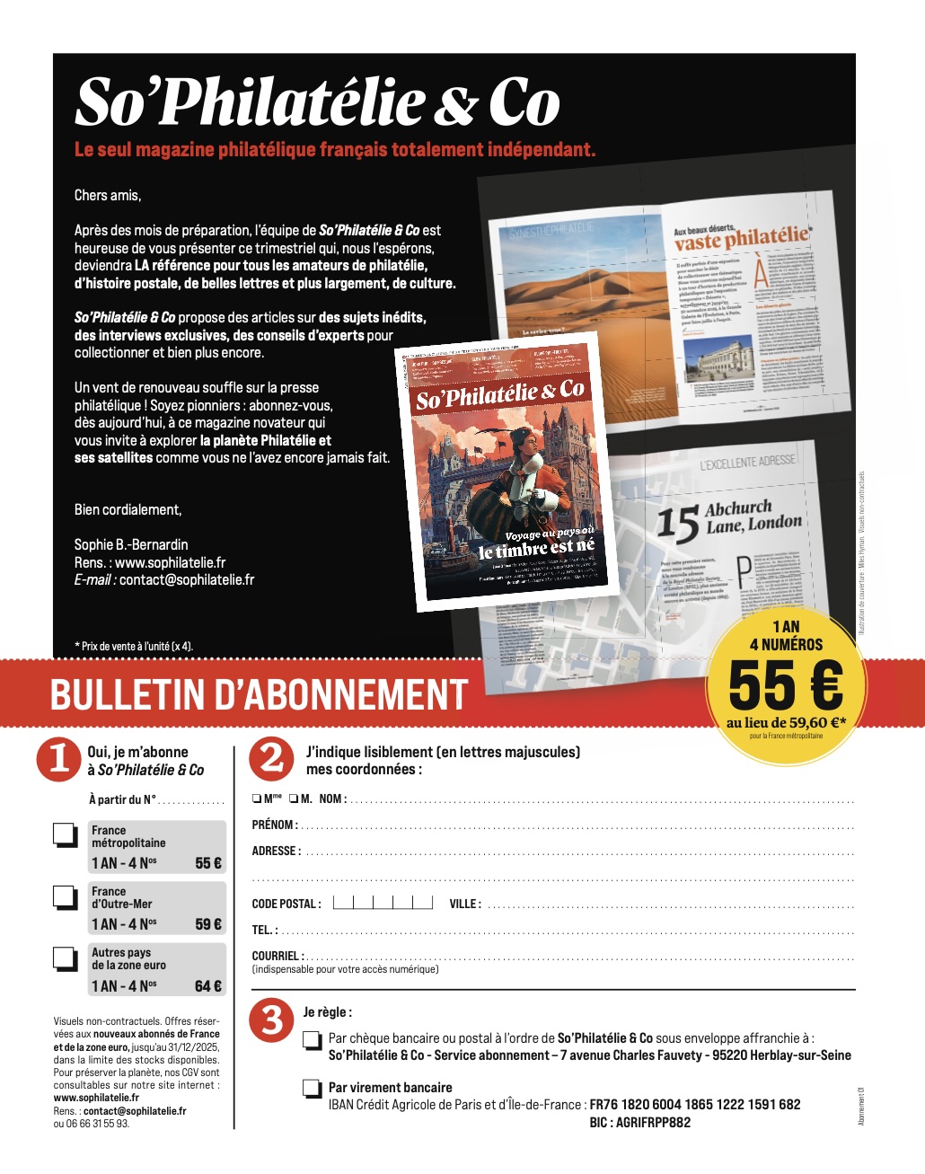 Deux de nos rubriques explorent les liens de personnalités non-philatélistes avec les timbres. Cet automne, lisez : • L'interview exclusive avec l'actrice franco-britannique Camille Rutherford. • Le portrait de Mav, the artist.