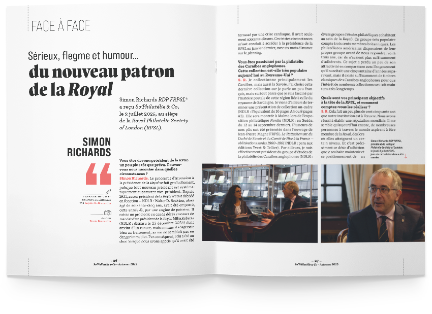 Pour le numéro 1, Simon Richards, le président de la Royal Philatelic Society of London, s’est brillamment livré à ce double exercice de l'interview et du questionnaire de So'Philatélie, inspiré du questionnaire de Proust.