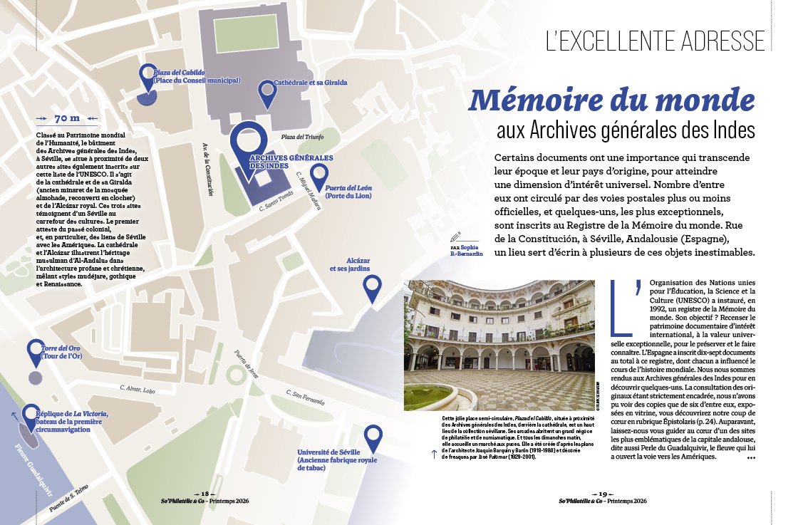 So'Philatélie & Co vous présente les Archives générales des Indes, à Séville, Andalousie (Espagne), écrin de plusieurs documents classés au Registre Mémoire du monde de l'UNESCO, dont la lettre de 1522 à Charles Quint par Elcano, premier circumnavigateur.