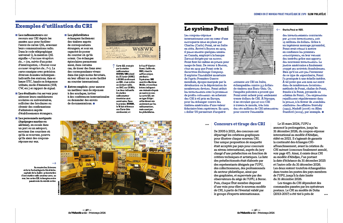 Nous prenons le temps de revenir sur près de 120 ans de coupons-réponse internationaux (CRI), alors que le dernier CRI sera échangé le 31 décembre prochain. Découvrez également le nouveau grand chantier philatélique et connecté de l'Union postale universelle (UPU) : le WNS 2.0.