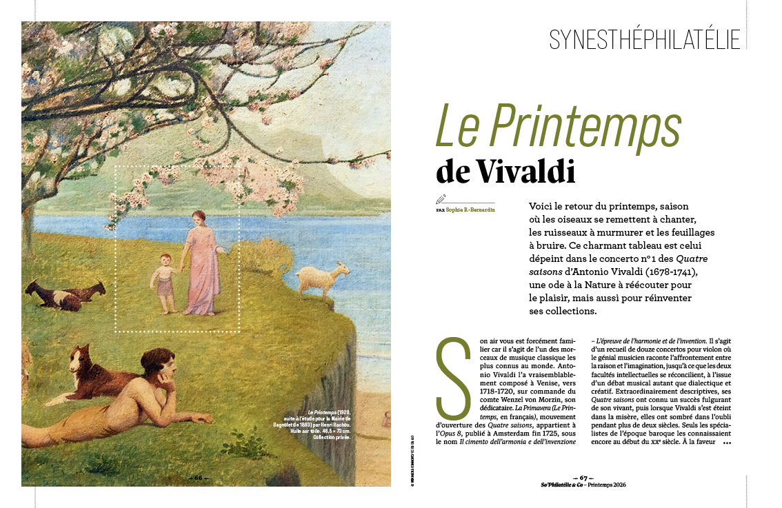 Totalement inédite en presse, cette rubrique nous a été inspirée par Charles Baudelaire (1821-1867). Dans un poème connu sous deux intitulés, Synesthésies ou Correspondances, issu du recueil Les Fleurs du Mal, le poète symboliste évoque les liens entre idées et perceptions, sphère matérielle et quête spirituelle. Or, un événement culturel – exposition, concert, pièce de théâtre… – ouvre tout un monde à qui le regarde avec des yeux de philatéliste. Cette vision immersive de la thématique en philatélie joue sur l’interculturalité et la transdisciplinarité. Dans ce numéro 3, nous vous convions à réécouter Le Printemps de Vivaldi pour créer ou enrichir vos collections.
